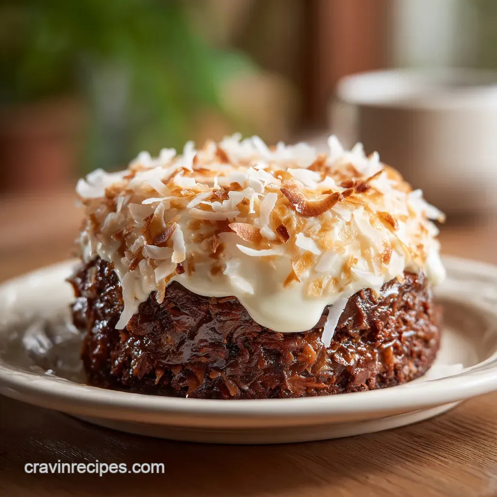 The coconut pecan custard frosting. The cake itself uses a mild, sweet chocolate bar base rather than dark cocoa powder, resulting in a softer flavor.