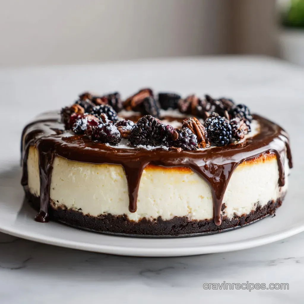 Homemade buttery caramel, toasted pecans, and a rich chocolate ganache drizzle. This combination provides the necessary textural contrast to the smooth, baked cheesecake base.